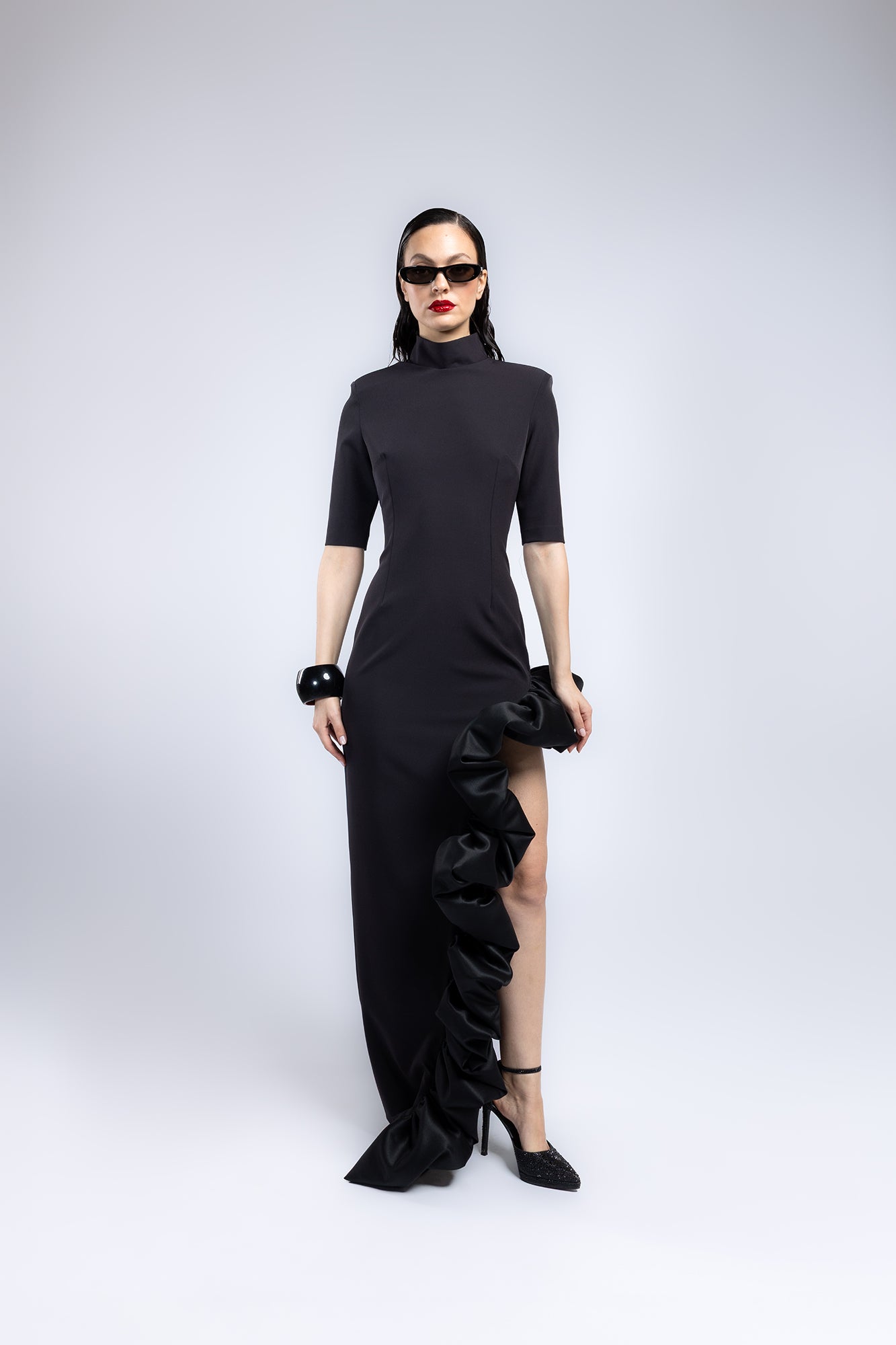 Abito nero asimmetrico con maniche a mezza lunghezza, collo alto e gonna drappeggiata con volant che creano un effetto scultoreo sullo spacco profondo.
