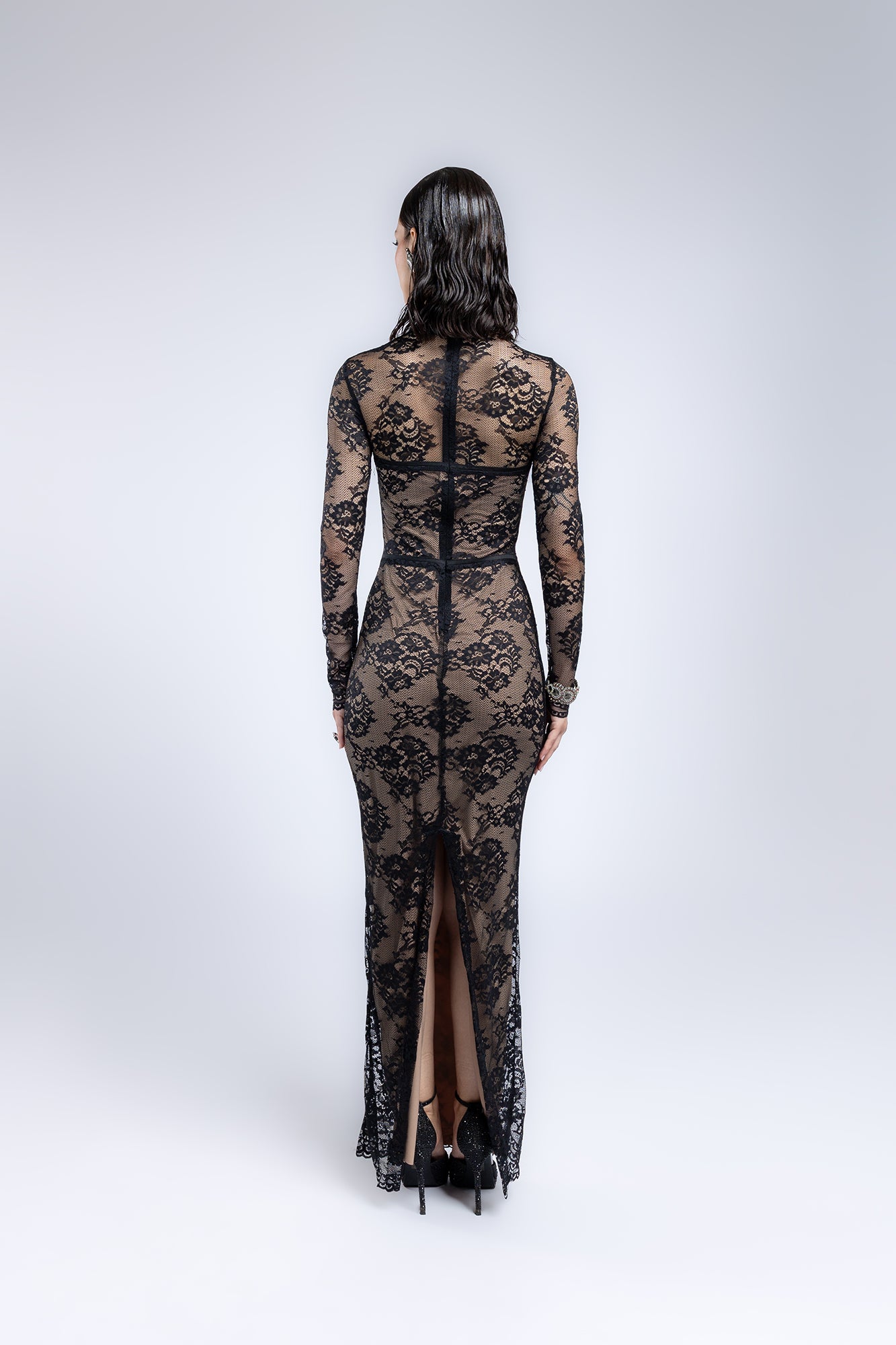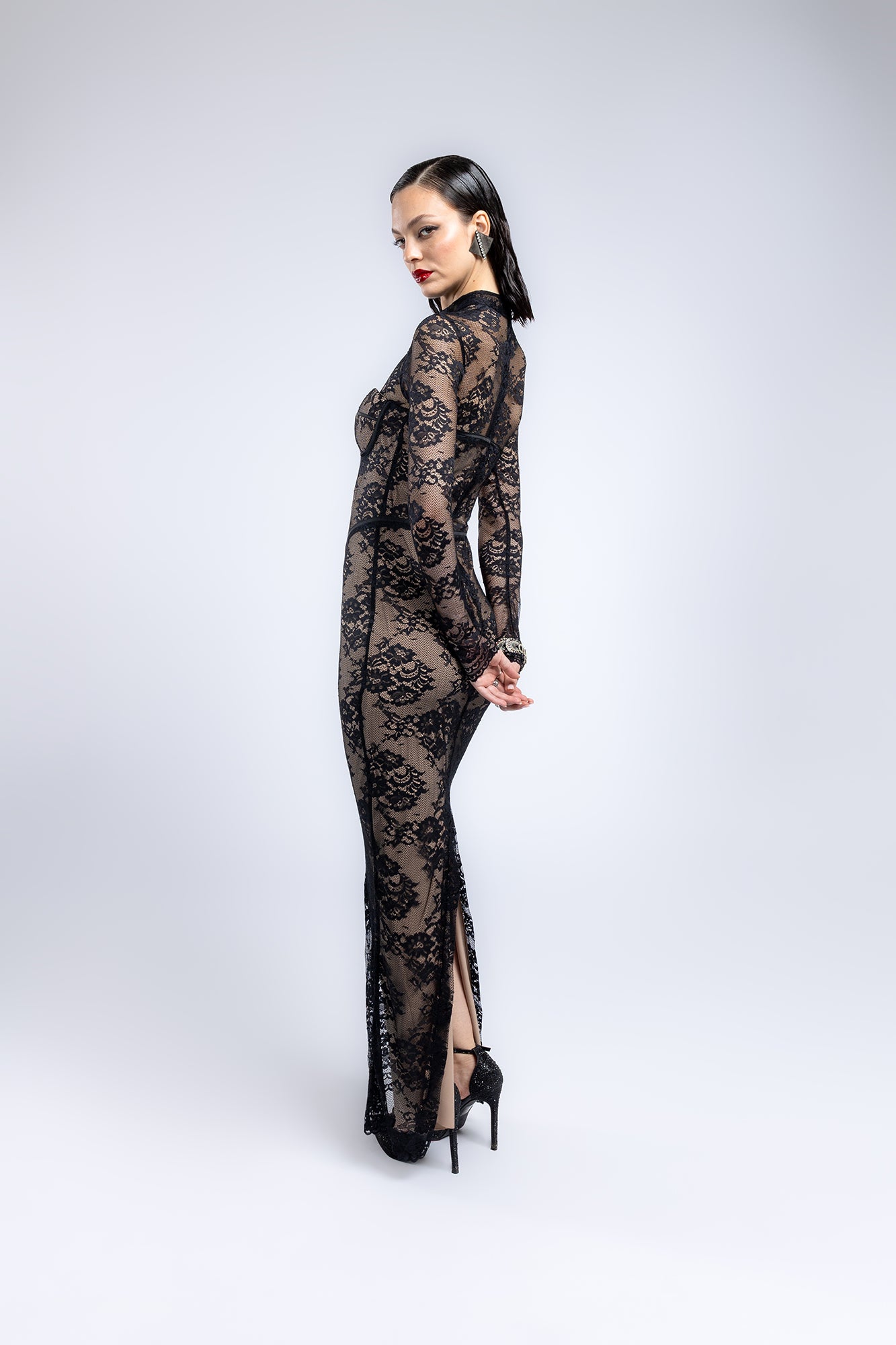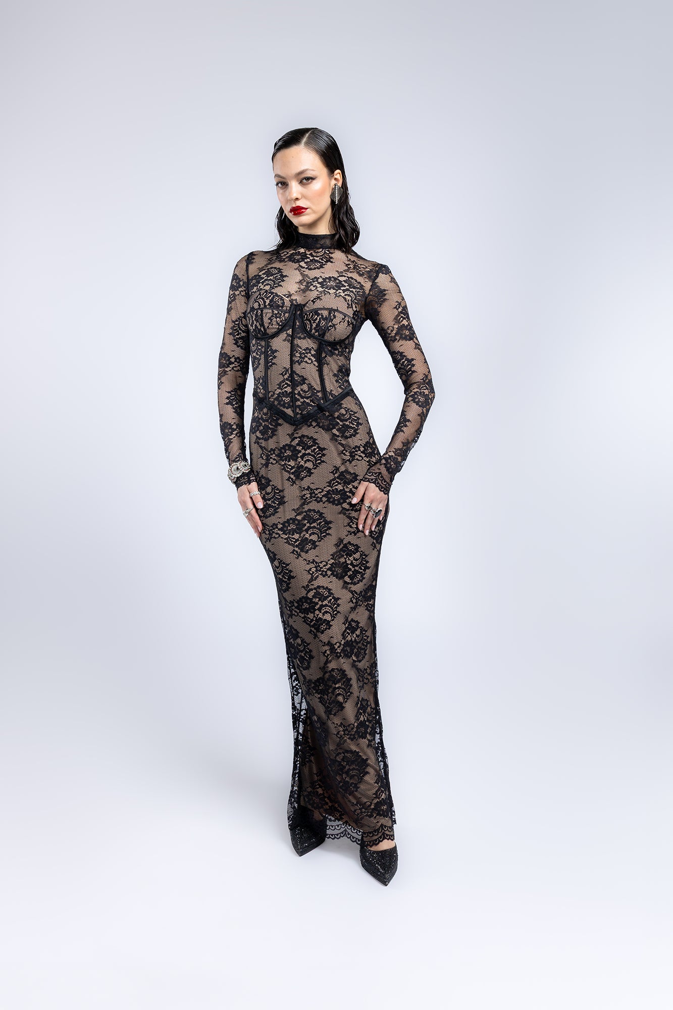 Abito lungo aderente in pizzo nero trasparente su base nude, con maniche lunghe, scollo a cuore e dettagli stile corsetto. Elegante e seducente, perfetto per eventi serali.