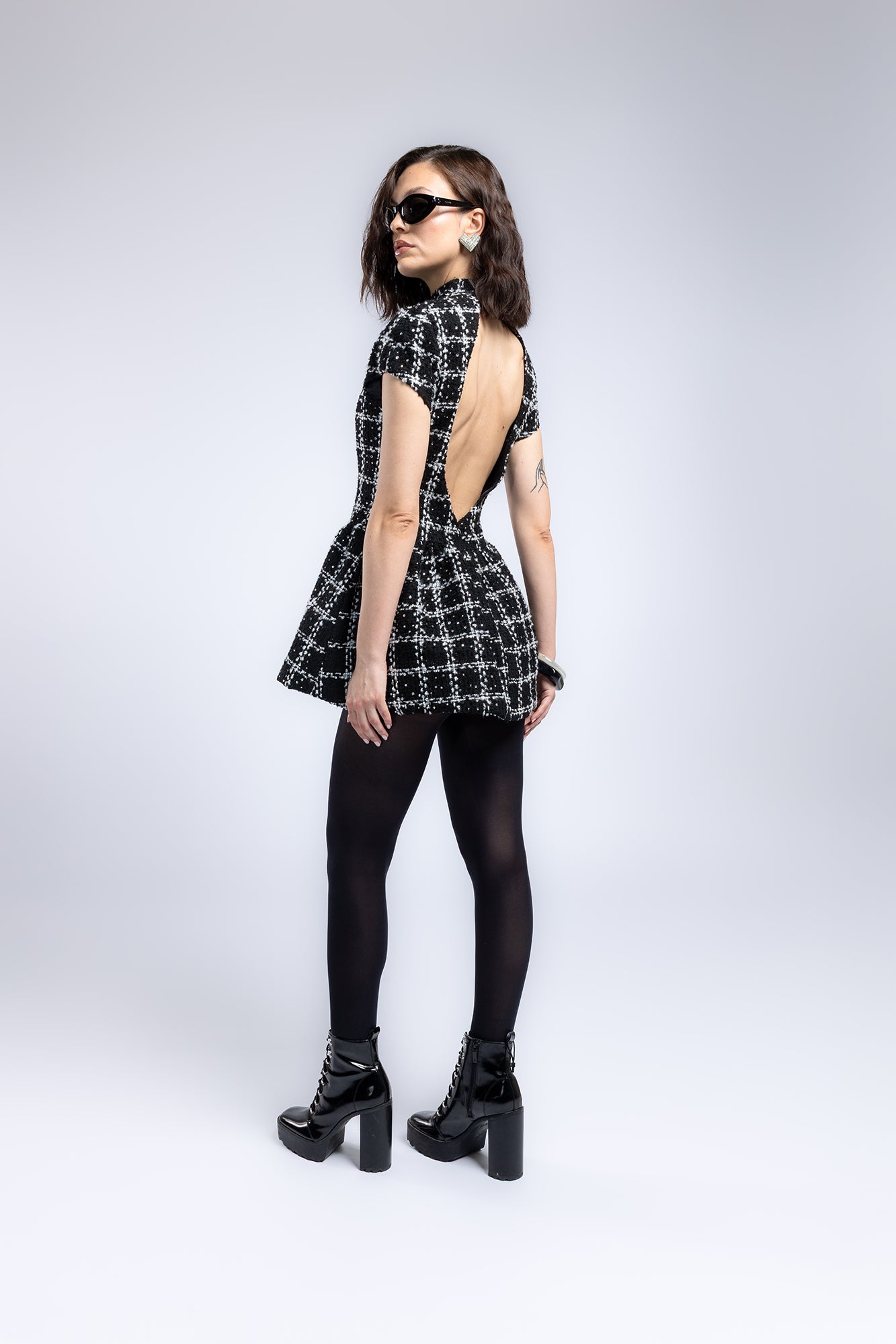 Abito corto in bouclé dal carattere sofisticato, impreziosito da dettagli di strass che catturano la luce con discreto splendore. La linea mini esalta la femminilità con un tocco moderno e glamour, ideale per serate speciali o eventi in cui brillare con eleganza.