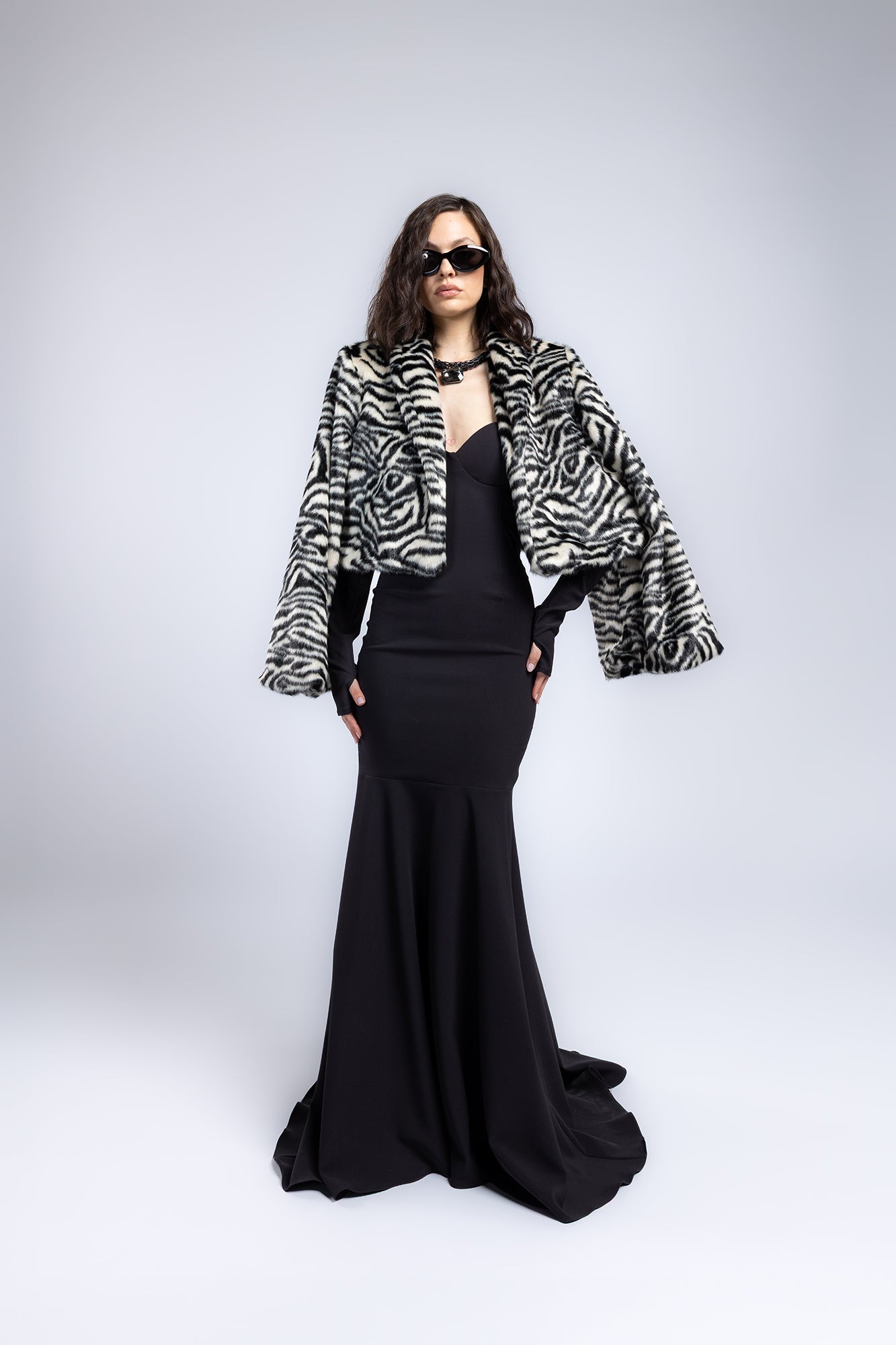 Ecopelliccia corta dal pattern zebrato, con spalline che conferiscono struttura e stile.