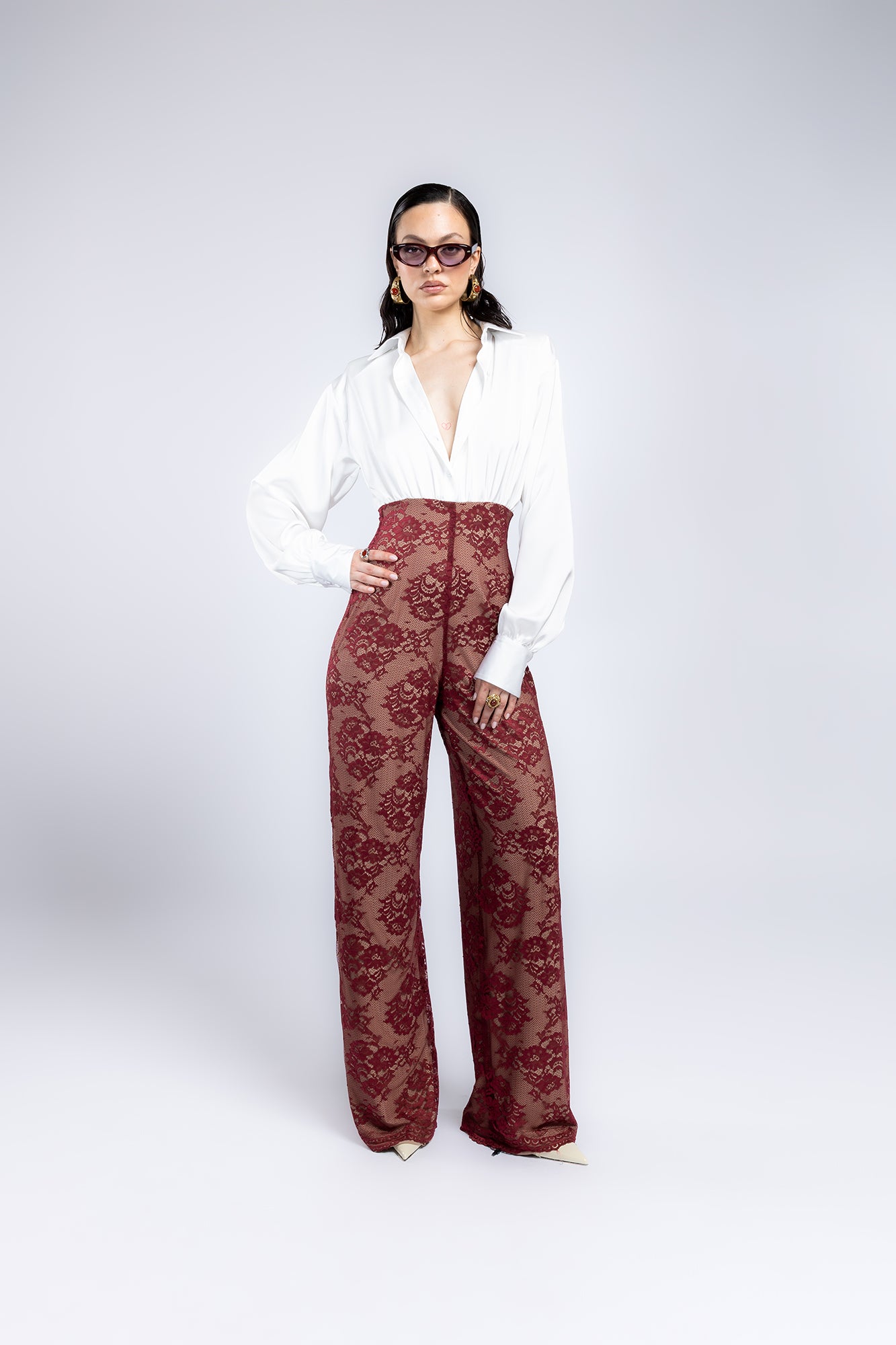 Jumpsuit elegante con camicia in satin dalle spalline sottili e pantaloni lunghi a palazzo in pizzo. Il satin lucido dona luminosità e raffinatezza, mentre il pizzo aggiunge femminilità e movimento. La silhouette valorizza la figura con equilibrio e leggerezza, ideale per look sofisticati e serate speciali.